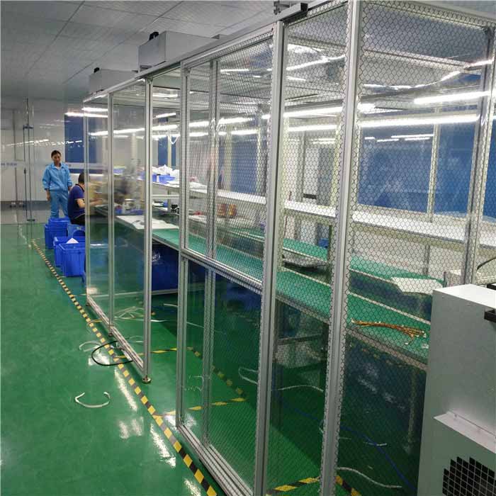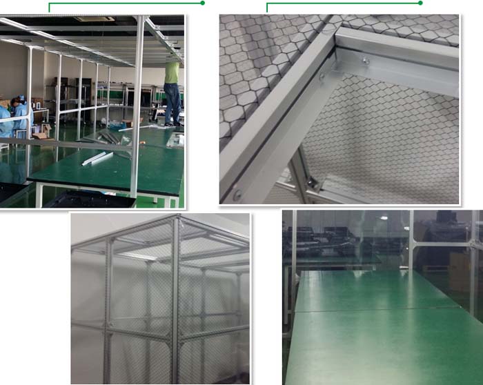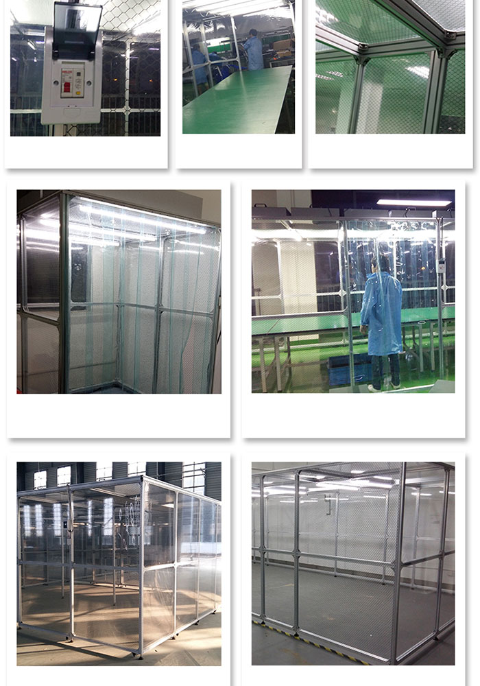 高效過濾器放置在由放在不銹網支架支撐棚架的托框上。頂部由盲板鋪蓋,密縫嚴密,四周用防靜電簾圍縫,四周底部利用正壓自然排風等形式,使潔凈棚區內達到潔凈度。潔凈棚其具有安裝快速、施工周期短、價格低廉、移動方便等特點,如流水線作業區域,高精確度產品組裝區。